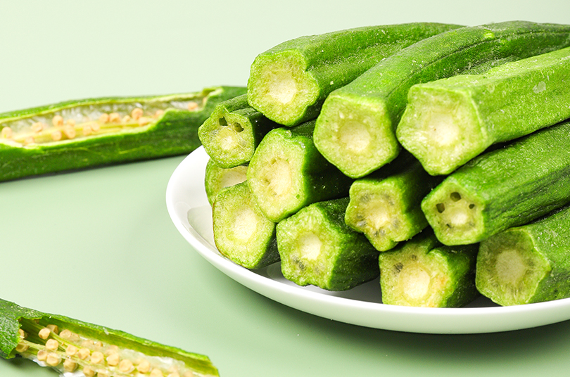 新鲜秋葵,采用VF工艺制成秋葵脆,锁住新鲜,锁住美味,使秋葵脆保持原有的色、香、味、形,原滋原味,酥脆爽口,蔬香四溢,齿颊留香。