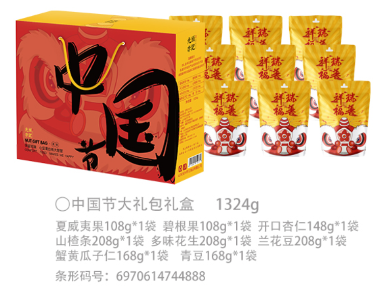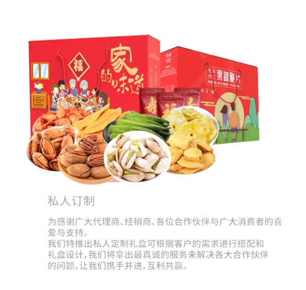 手绘团圆饭插画,9款红色内袋,分别印有:福禄寿喜财吉祥顺乐9个字,象征着美好的寓意,3种坚果、3种果蔬、3种果脯,寓意长长久久,将新年祝福传递千家万户。